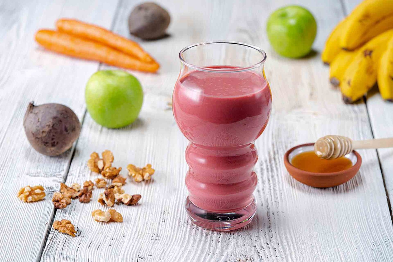 Taze sıkılmış portakal, muz, havuç ve bal karışımıdır.(Meyveler sezona göre değişebilir.)
